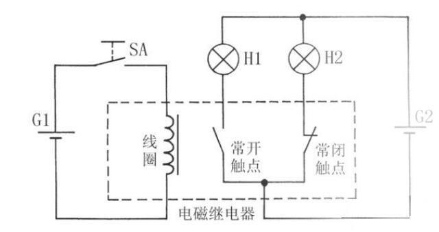 電磁繼電器的工作原理可以通過“下圖所示的實驗電路來進一步說明:當開關(guān)SA斷開時,電磁繼電器的線圈沒有電流流過,線圈沒有磁場產(chǎn)生,電磁繼電器處于“釋放”狀態(tài),其常開觸點斷開、常閉觸點閉合, 燈泡H1不亮,H2亮。當開關(guān)SA閉合時,電磁繼電器的線圈中有電流流過,線圈產(chǎn)生磁場,吸合內(nèi)部銜鐵,使電磁繼電器處于“吸臺”狀態(tài),