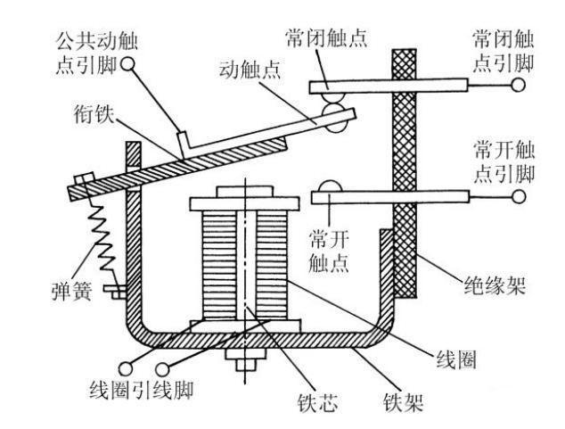 它主要由鐵芯線圈、銜鐵(動鐵芯)、彈簧、動觸點、靜觸點和一些接線端等組成。靜觸點包括常閉觸點、常開觸點兩種。平時,動觸點與常閉觸點接通。只要在線罷兩端加上一定的電壓,線圈中就會流過一定的電流,從而產(chǎn)生電磁效應,銜鐵就會在電磁力吸弓的作用下克服彈簧的返回拉力吸向鐵芯,從而帶動動觸點與常閉觸點分離,與常開觸點接通。當線圈斷電后,電磁的吸力也隨之消失,銜鐵就會在彈簧的反作用力下返回原來的位置,于是動觸點與常閉觸點恢復接通,與常開觸點分離。