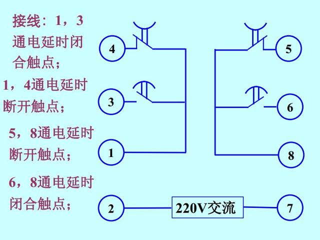 5-8腳為通電延時閉合觸點,接通電源,給了信號之后線圈得電,等到設置時間到達以后,觸點閉合;
