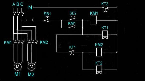 各個引腳的含義我們已經搞清楚了,下面就可以根據控制原因進行接線,我們以下圖為例,在電路中加入KT通電延時時間繼電器,當按下啟動按鈕SB2線圈KT1、KM1得電交流接觸器KM1吸合,電動機M1轉動,延時閉合開關KT1到達時間吸合,KM2、KT2得電,交流接觸器KM2得電吸合,電動機M2轉動,延時斷開開關KT2在到達時間以后斷開,整個控制回路斷開,所有電機停止轉動;